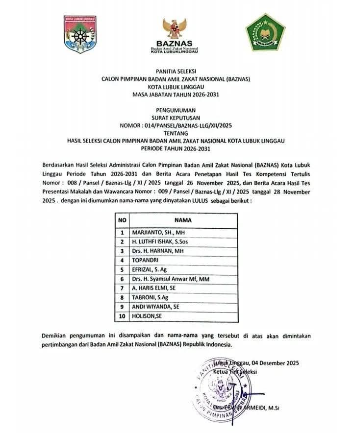 Dengan demikian, akan terpilih pimpinan BAZNAS yang mampu meningkatkan kepercayaan masyarakat terhadap lembaga pengelola zakat di Kota Lubuk Linggau.