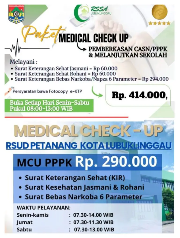 Di RSUD Petanang Kota Lubuk Linggau, tarif MCU untuk PPPK dipatok sebesar Rp290.000, yang meliputi surat keterangan sehat (KIR), surat kesehatan jasmani dan rohani, serta surat bebas narkoba 6 parameter. Pelayanan MCU di RSUD Petanang ini berlangsung dari Senin hingga Kamis, pukul 07.30-14.00 WIB.