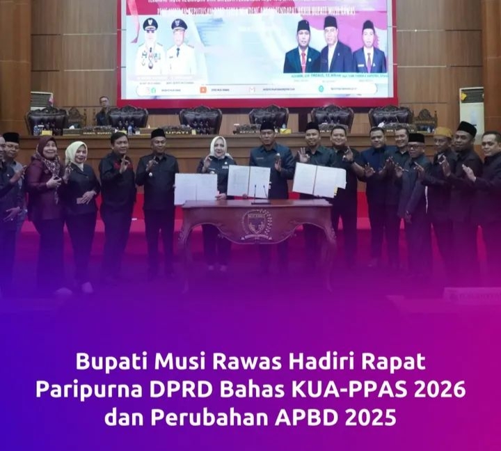 Murexsnews.com Musi Rawas – Bupati Musi Rawas Hj Ratna Machmud menghadiri Rapat Paripurna DPRD Kabupaten Musi Rawas dalam rangka Penandatanganan Nota Kesepakatan Kebijakan Umum Anggaran (KUA) dan Prioritas Plafon Anggaran Sementara (PPAS) Tahun Anggaran 2026. Mendengarkan Laporan Hasil Pembahasan Bupati Musi Rawas dan Wakil Bupati Musi Rawas Komisi-Komisi DPRD terhadap Nota Keuangan dan Raperda Perubahan APBD Kabupaten Musi Rawas Tahun 2025 dan Pengambilan Keputusan DPRD serta Mendengarkan Pendapat Akhir Bupati Musi Rawas, bertempat di Ruang Rapat Paripurna DPRD Kabupaten Musi Rawas, Senin (8/9/2025).